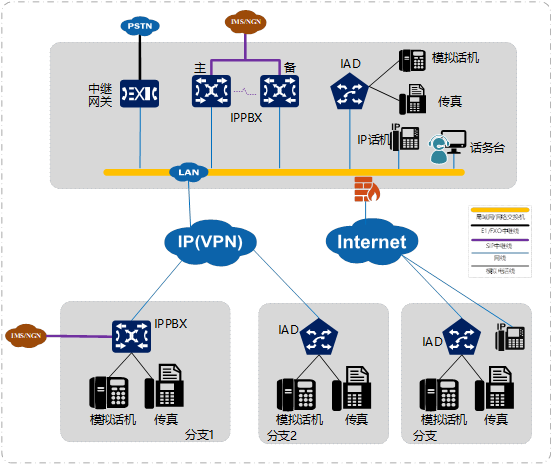 各节点下的IP话机、话务台、SIP用户、IAD代理的模拟话机和传真机都注册到总部节点主语音系统。